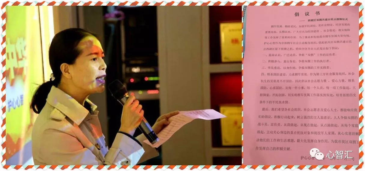 杭州护心心智心理咨询服务中心负责人:王金华    宣读双拥共建倡议书