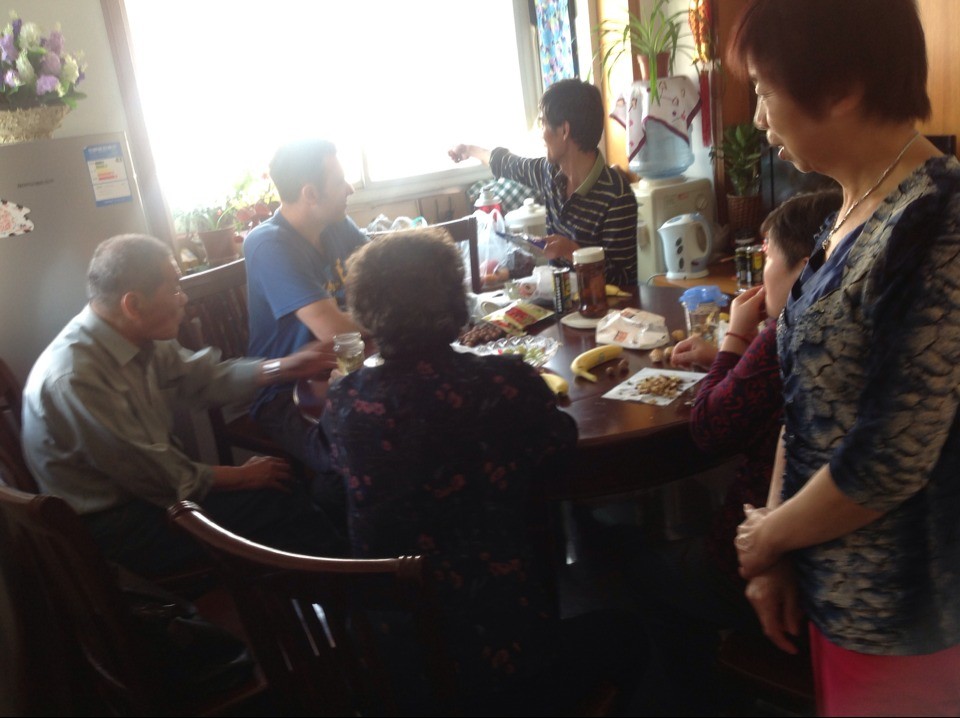 10月26号南星街道水澄桥社区组织了失独家庭的小型聚会。上午9时,失独家庭纷纷到达,与工作人员们一起准备聚会,另有部分失独父母带来自己的拿手好菜与大家一起分享。在聚会开始前我大声告诉他们,今天还会有一个志愿者,会不会不方便,他们欣然接受,当门敞开的一霎那,还是感受到大家对大鼻子的一种惊讶和拘束,由于文化的关系,老外的包容心,尊重以及接纳程度都非常高,聪慧的TIM(杭州电台主持人 澳大利亚籍)一开始就主动引发老人的话题,打开隔阂,送去不一样的谈资。其实,真诚和敞开是最好的关系调节剂,只要用心大家就会感知,正如活动结束后TIM 对我说:“我感受到他们的善良,希望把最好的都给客人,但更希望他们能更真实的面对自己,爱自己”。