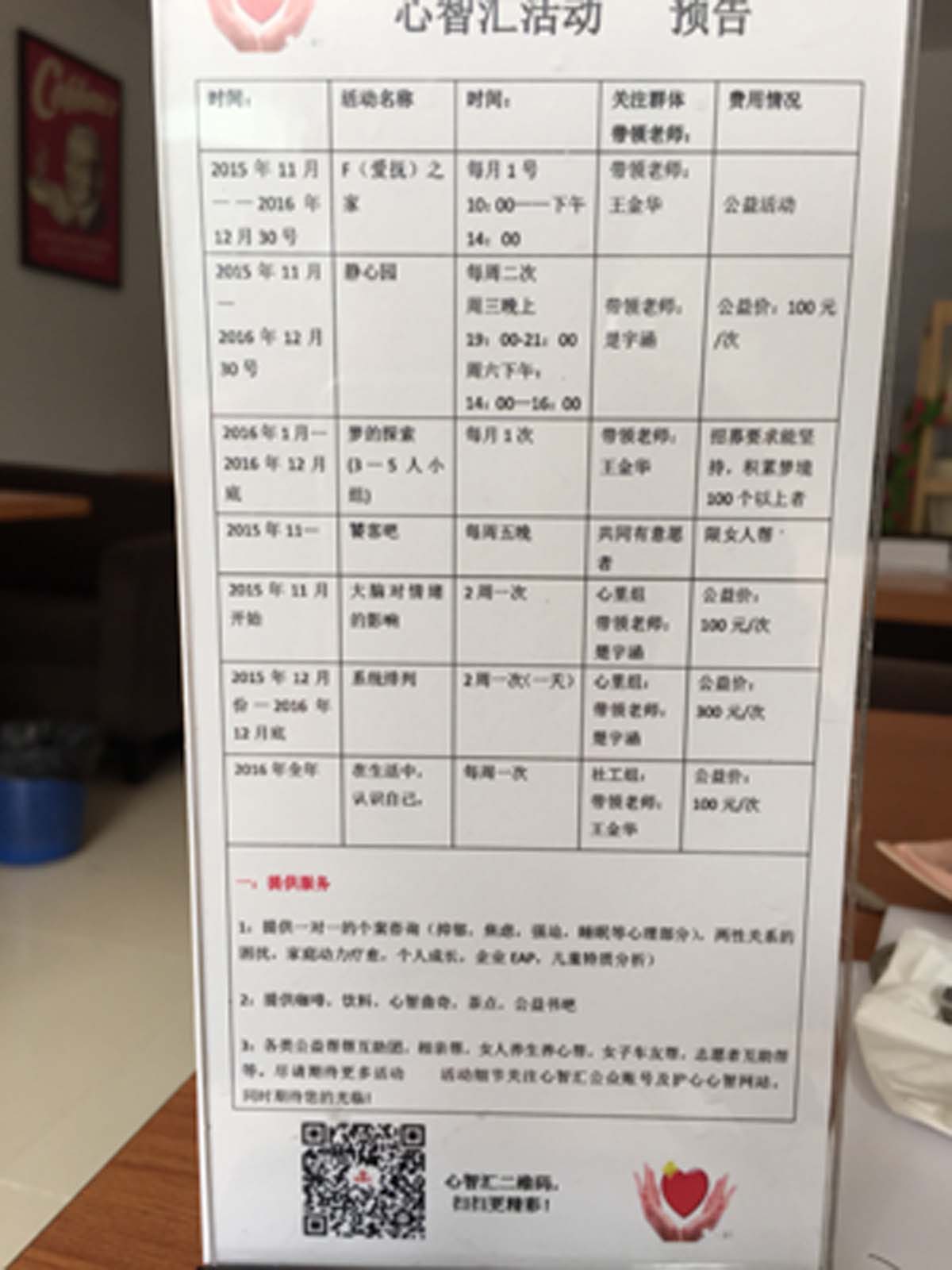 地点: 心智汇(丰潭路600号) 第三室 费用:每次100元(公益价) 支付方式:微信号:huxinxinzhi66 (心智汇)微信支付 点击二维码 登记报名 【心智汇】心理项目主要涉及内容: A:个人成长咨询 (1:一对一个体咨询 2: 心理师专业人员督导 3:个人成长培训) B:家庭《族》治疗 (1:婚姻成长咨询2:家庭《族》治疗3:亲子关系成长咨询儿童发展咨询 C:企业团体成长 (团体成长课程安排2:企业员工心理 健康促进方案3:职业心理减压) D:脑波仪减压及睡眠障碍治疗 护心心智:是在市民政注册,针对女性及弱势群体开展心理疏导类的公益组织。 地址:中国.杭州丰潭路600号(心智汇) 预约电话: 150—8870—6150(24小时) 公司网站: www.huxinxinzhi.com心智汇公众账号:huxinxinzhi55